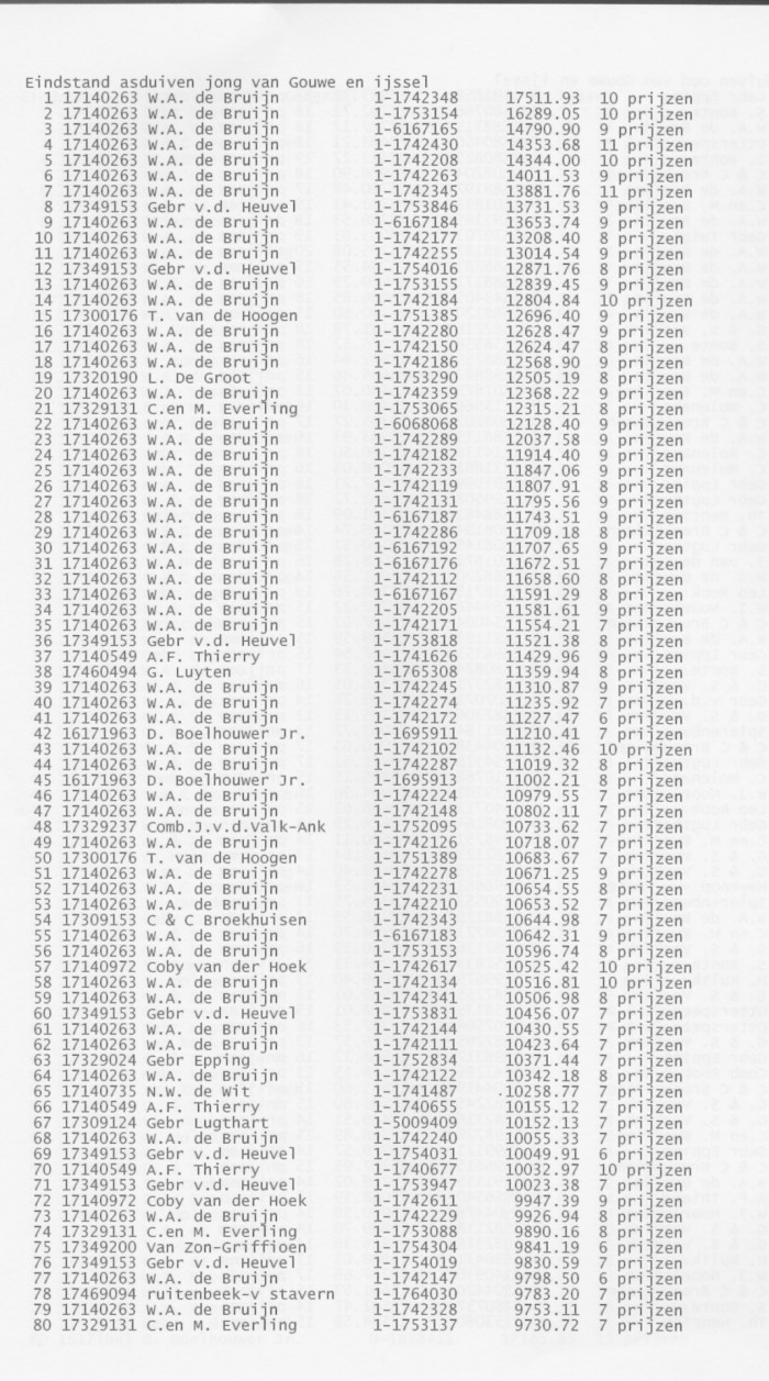 Willem / 29 december 2011 Overrompeling in de eindstand asduiven jong van het samenspel Gouwe-IJssel met 271 spelende hokken Delen: Klik om te delen op X (Opent in een nieuw venster) X Klik om te delen op Facebook (Opent in een nieuw venster) Facebook Vind-ik-leuk Aan het laden...